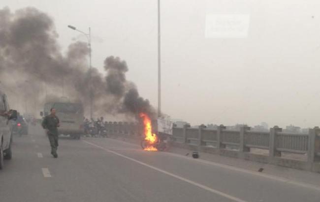 Khoảng 8 giờ sáng nay (15.4), xe máy chở hàng mang BKS 30K2 - 1018 do một nam thanh niên điều khiển lưu thông trên cầu Vĩnh Tuy hướng Hà Nội - Quốc lộ 5 thì bất ngờ bốc cháy.