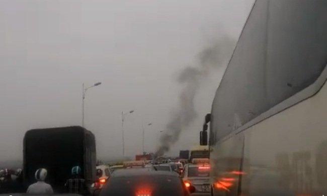 Anh Nguyễn Hoàng Anh, một người chứng kiến sự việc kể lại, vào khoảng thời gian trên, nam thanh niên đang điều khiển xe máy hiệu Dream, phía sau chở một thùng hàng đi trên cầu Vĩnh Tuy. Khi đến đoạn giữa cầu, chiếc xe bốc khói từ phía sau rồi ngọn lửa bùng lên. Nam thanh niên vứt xe máy bỏ chạy. Nhiều người đi đường cũng một phen hốt hoảng.