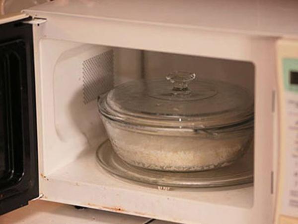 Chỉ cần cho cơm nguội vào bát thuỷ tinh. Tiếp tục lấy màng bọc thực phẩm bọc kín lại. Sau đó cho vào nồi vi sóng cơm rất ngon và không bị khô.