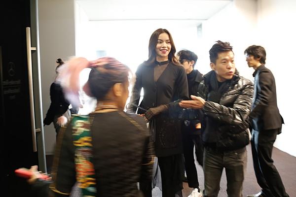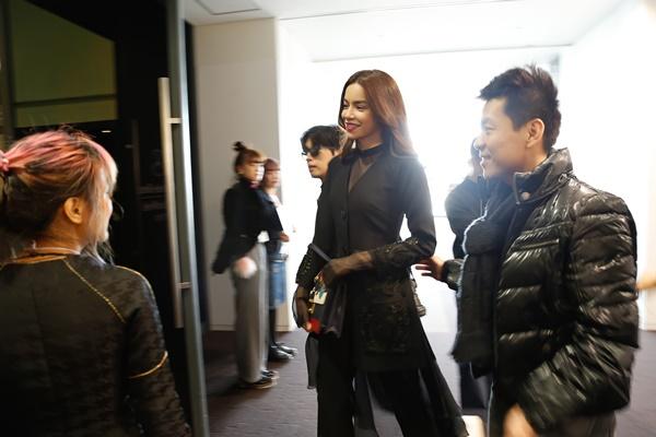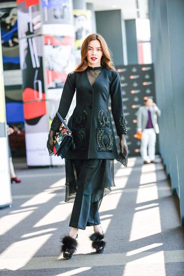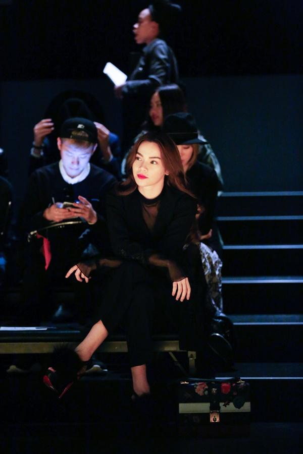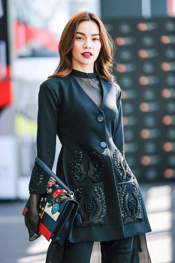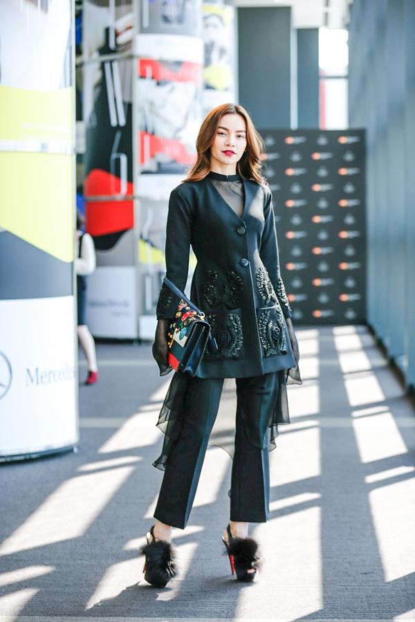 Có mặt tại đêm diễn mở màn, Hồ Ngọc Hà diện nguyên cây đen – đây là bộ trang phục nằm trong BST mới mà Công Trí thiết kế riêng cho cô. Với mái tóc xõa tự nhiên cùng phụ kiện là túi xách hàng hiệu Gucci và giày đế đỏ, Hà Hồ trông rất sang trọng, bí ẩn và lịch lãm.