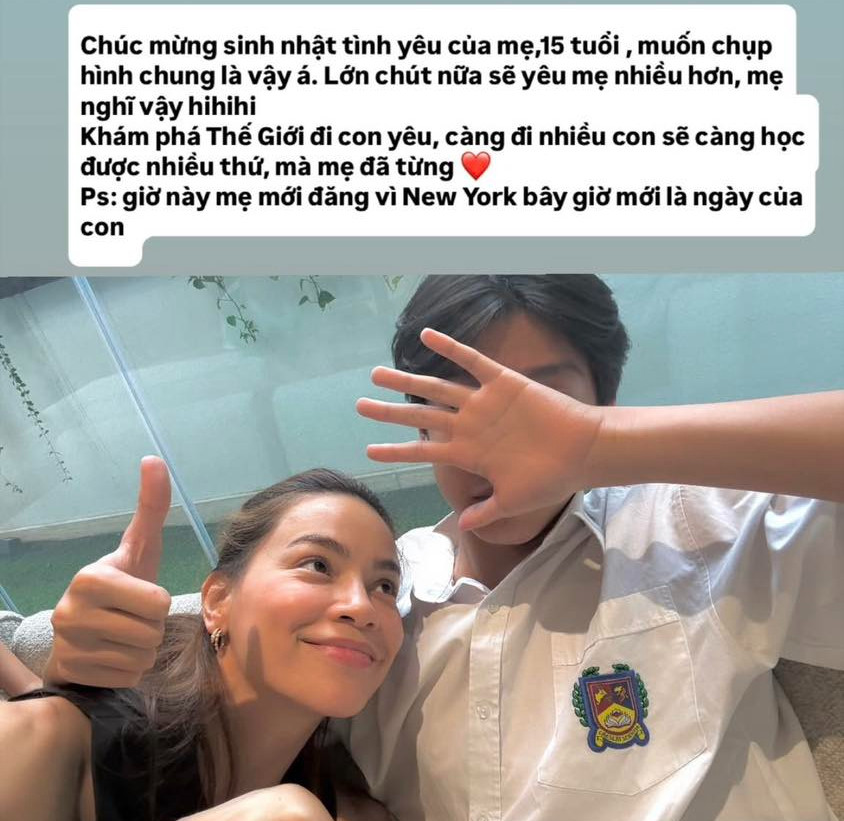 Trong khi chồng cũ đã chúc mừng tuổi mới của con trai sớm thì mới đây giọng ca "Cả một trời nhớ thương" mới đăng story. Cô viết: "Chúc mừng sinh nhật tình yêu của mẹ, 15 tuổi, muốn chụp hình chung là vậy á. Lớn chút nữa sẽ yêu mẹ nhiều hơn, mẹ nghĩ vậy, hihi. Khám phá thế giới đi con yêu, càng đi nhiều con sẽ càng học được nhiều thứ mà mẹ đã từng".