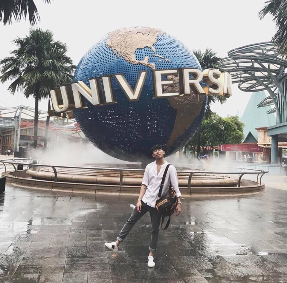 Stylist Hoàng Ku khoe loạt street style đơn giản, thanh lịch với sơ mi trắng cổ tàu mix quần sắn gấu và giầy sneaker ở Singapore.