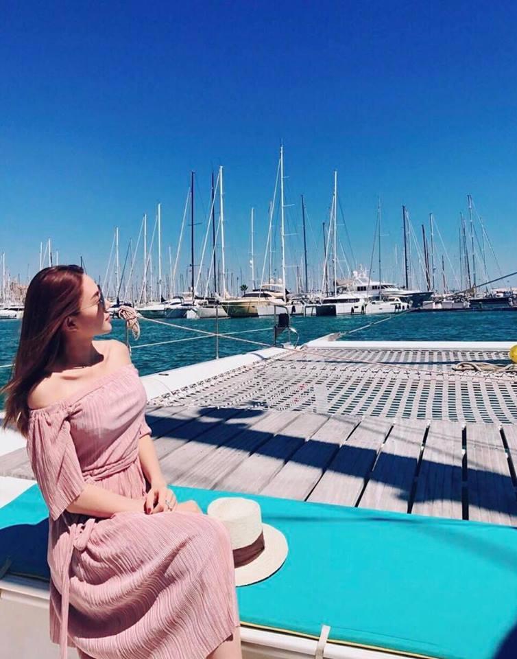Lan Khuê diện váy xuyên thấu gam màu xanh pastel cùng sandals dây mảnh và túi Dior xuống phố. HLV The Face ghi điểm bởi phong cách gợi cảm mà vẫn trẻ trung.
