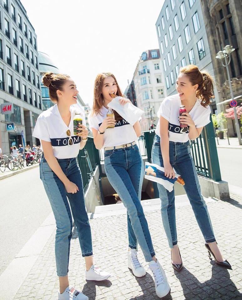 Bộ ba gà cưng Ngọc Trinh - Lê Hà - Quỳnh Thư của ông bầu Vũ Khắc Tiệp diện trang phục sinh ba đơn giản với áo phông mix quần jean thu hút mọi ánh nhìn ở trời Âu.