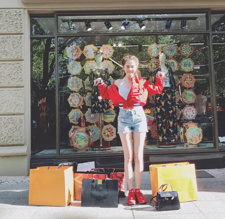 Ngọc Trinh nổi bật năng động xuống phố với áo crop-top, short jean, khoác áo bomber màu đỏ ton-sur-ton cùng giầy sneaker. "Nữ hoàng nội y" mua sắm hàng hiệu thả ga trong chuyến lưu diễn tại Đức.