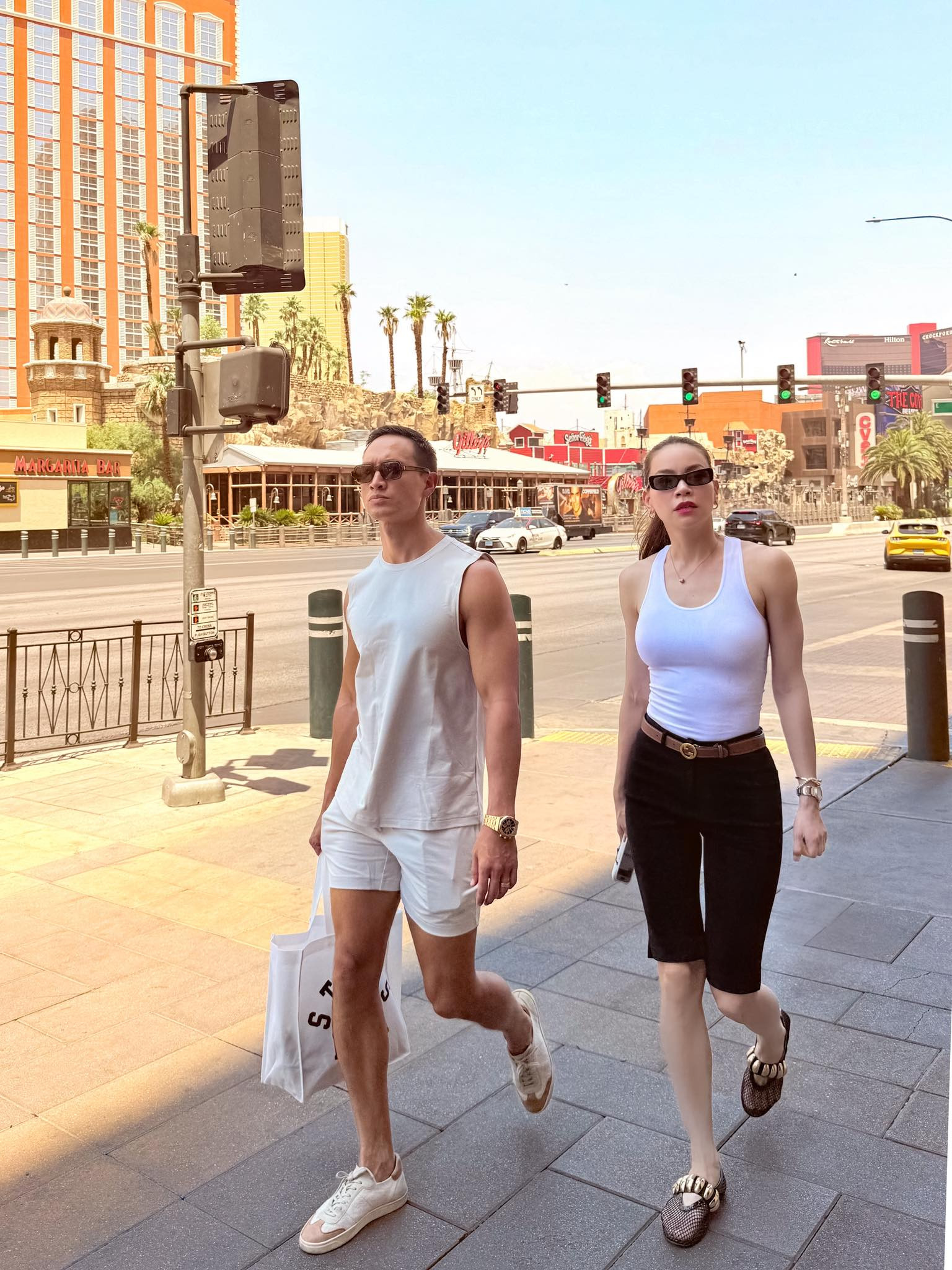Người đẹp cũng tung loạt hình khoe street style cùng ông xã Kim Lý. Hồ Ngọc Hà tiếp tục thể hiện sự tinh tế khi chọn trang phục đồng điệu với bạn đồng hành. Cả hai đều chuộng gam màu trung tính, nhưng biết cách phối kết sao cho cá tính.
