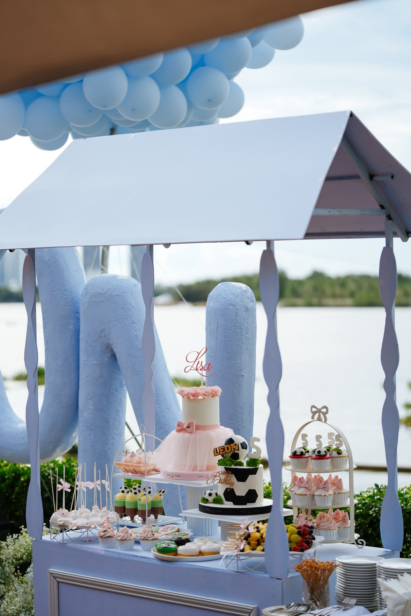 Được biết, người đẹp tổ chức tiệc sinh nhật cho Leon và Lisa tại một khu nghỉ dưỡng cao cấp ở Sài Gòn. Hà Hồ đầu tư concept trang trí tiệc sinh nhật bên bờ sông với hai tông màu chủ đạo là xanh dương và hồng.
