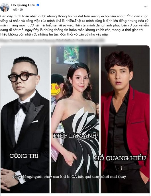Tuy nhiên, những thông tin này chỉ là tin đồn chưa được kiểm chứng. Sau khi Diệp Lâm Anh lên tiếng đính chính thì mới đây Hồ Quang Hiếu cũng có động thái trên trang cá nhân.