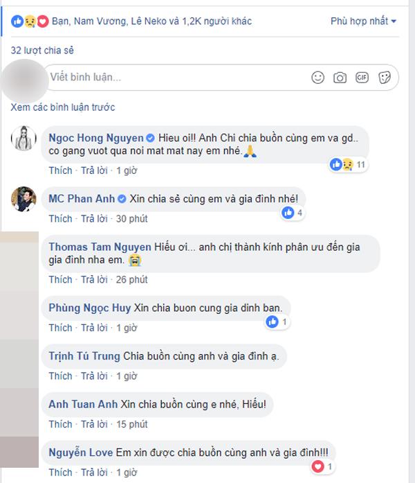 Khi hay tin cha nam ca sĩ qua đời, nhiều đồng nghiệp và bạn bè đã gửi lời chia buồn sâu sắc và động viên anh. "Hiếu ơi! Anh chị chia buồn cùng em và gia đình... cố gắng vượt qua nỗi mất mát này em nhé" - nữ ca sĩ Hồng Ngọc viết.