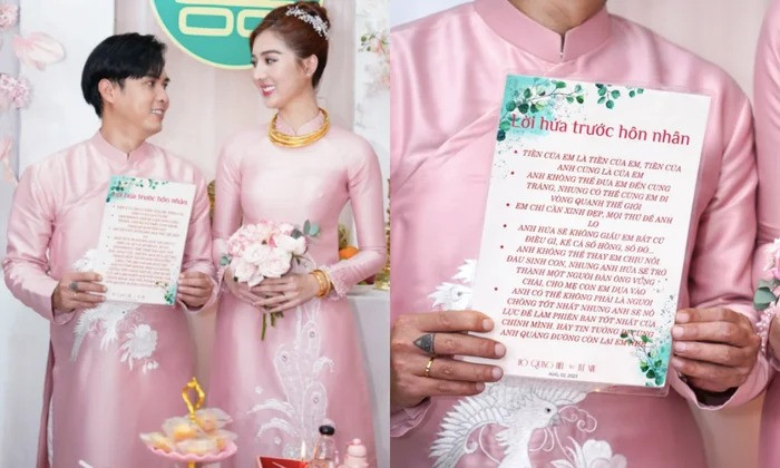 Được biết, Hồ Quang Hiếu và Tuệ Như đăng ký kết hôn vào tháng 5/2023, chỉ gần 2 tháng sau khi công khai. Sau đó, cả hai làm đám hỏi vào đầu tháng 8/2023 tại Cà Mau quê cô dâu. Thời điểm đó, nam ca sĩ cho biết anh và vợ dự định sẽ sinh con trước rồi mới tổ chức lễ cưới.