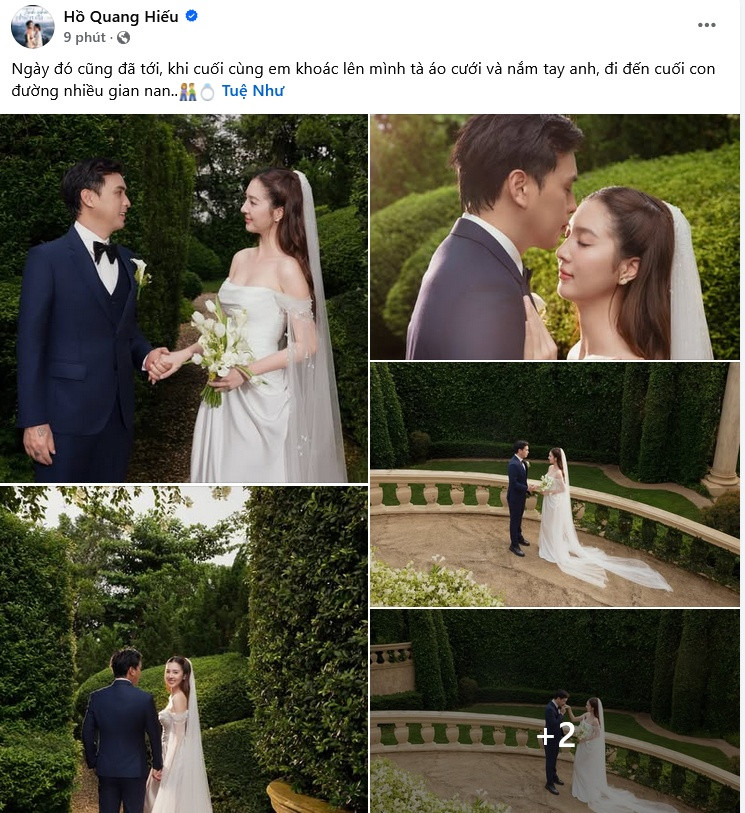 Nam ca sĩ đăng hình kèm dòng trạng thái: "Ngày đó cũng đã tới, khi cuối cùng em khoác lên mình tà áo cưới và nắm tay anh, đi đến cuối con đường nhiều gian nan" và tag tên bà xã Tuệ Như.