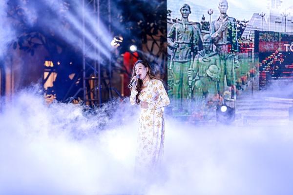 Hồ Quỳnh Hương diện áo dài tông trắng họa tiết hoa trải khắp thân áo. Cô kết hợp cùng bộ trang sức đính kết hình hoa sen với ý nghĩa đón một năm mới bình an, hạnh phúc cho mình và mọi người. Lựa chọn trang phục của cô toát lên vẻ nhẹ nhàng, thanh lịch. Nữ ca sĩ hát bài "Miền xa thẳm", một ca khúc quen thuộc và nổi tiếng về tình yêu tổ quốc lồng trong tình yêu đôi lứa.