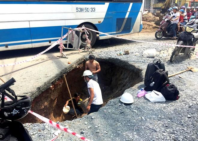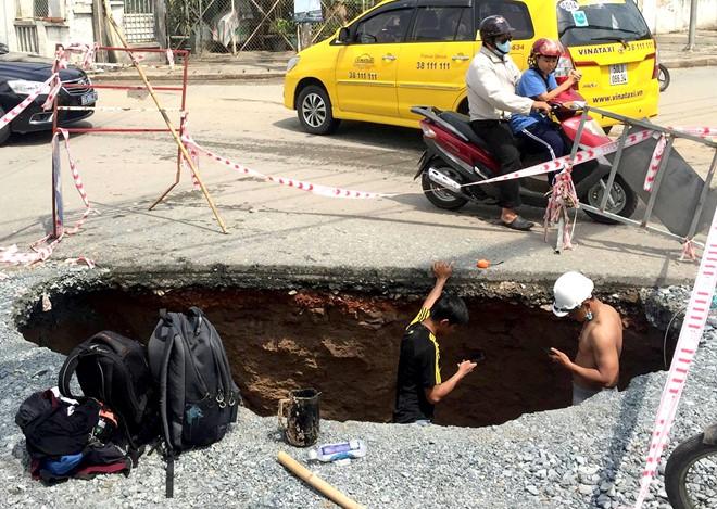 Đến sáng nay, miệng hố bị khoét rộng khoảng 2 m, chiều ngang 4 m, sâu khoảng 2 m. Sự cố khiến xe cộ qua đường Lê Văn Việt bị ùn tắc.