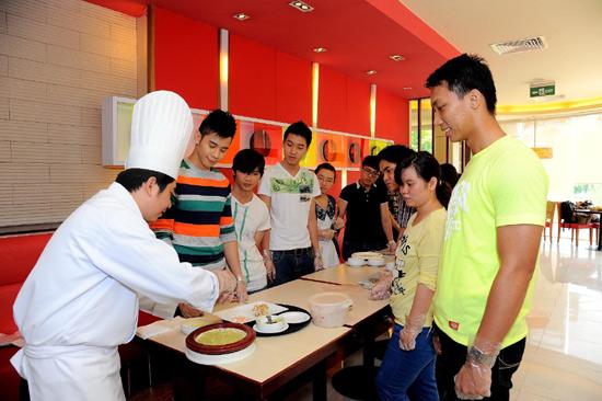 Hồ Vĩnh Khoa chăm chú nghe Chef Vũ - chuyên gia Pizza của Pizza Hut hướng dẫn cách làm món mới