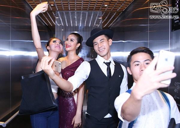 Bức ảnh hài hước của Phạm Hương và Hồ Vĩnh Khoa ở trong thang máy với tư thế selfie.