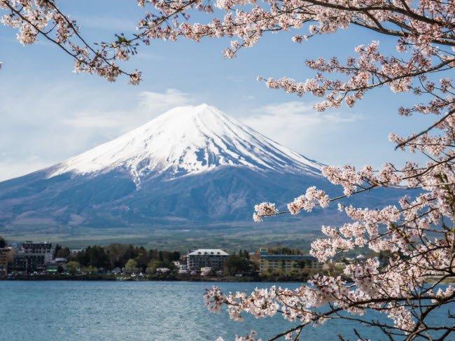 Hồ Kawaguchi gần núi Phú Sĩ ở Nhật Bản được coi là địa điểm lý tưởng nhất để chiêm ngưỡng vẻ đẹp của hoa anh đào.