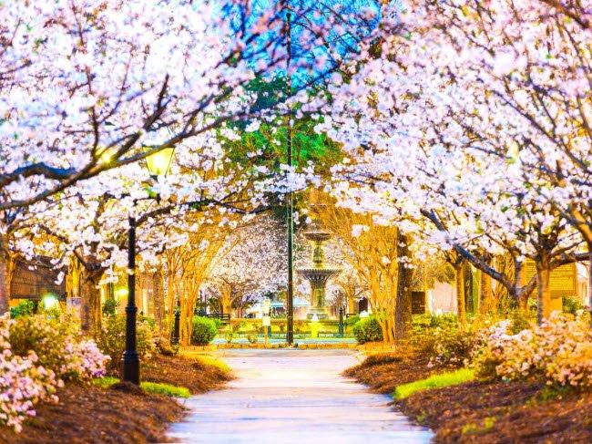 Tại Macon, hơn 300.000 cây hoa anh đào nở rộ biến thành phố này thành thiên đường màu hồng vào mùa xuân.