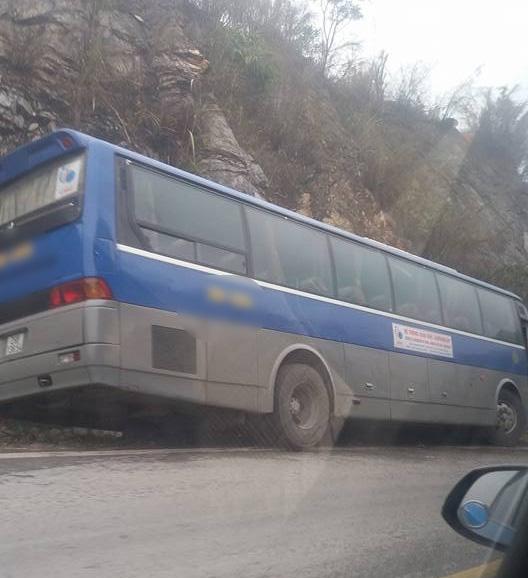 Tại hiện trường, chiếc xe ô tô 49 chỗ lao sát vào vách núi, rất may toàn bộ học sinh trên xe không bị thương.