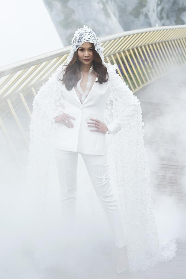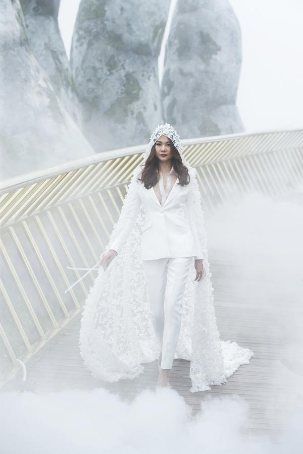 Trong làn sương trắng, thần thái của siêu mẫu càng nổi bật hơn. Bộ suit trắng được thiết kế theo phong cách menswear cá tính nhưng vẫn đằm thắm với thiết kế trùm đầu phủ quét đất mang đến vẻ đẹp nữ thần cho siêu mẫu