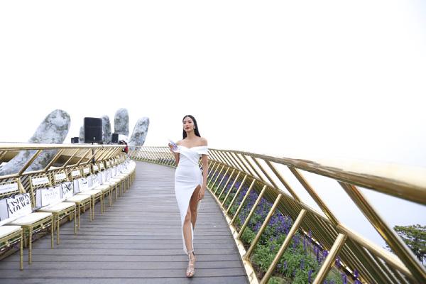 Một nhân vật khác cũng khéo “khoe chân” là siêu mẫu Hoàng Thùy. Cô nàng sải bước trên sàn catwalk dài đến 150m ở Cầu Vàng, Đà Nẵng