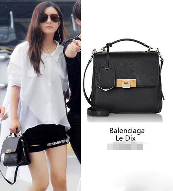 Khi mặc áo sơ mi trắng, quần shorts đen, cô mang theo chiếc túi Balenciaga