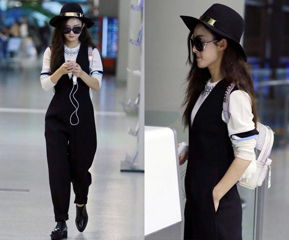 Mỹ nhân "Hoa thiên cốt" cá tính ở sân bay với quần yếm đen kết hợp áo nỉ trắng.