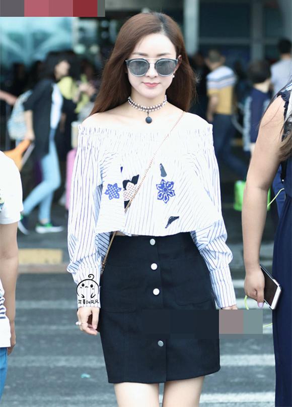 Triệu Lệ Dĩnh lựa chọn áo sơ mi trễ vai kẻ sọc kết hợp chân váy mini cài khuy