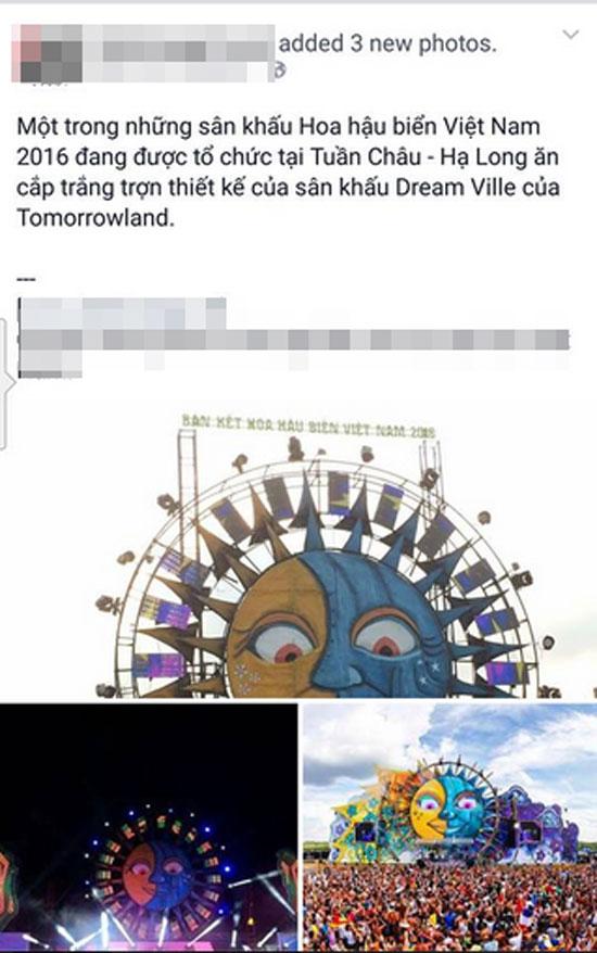Ngày hôm qua, bất ngờ trên một trang mạng xã hội chuyên về tổ chức sự kiện đăng tải hình ảnh sân khấu bán kết của cuộc thi HH Biển cùng với một số hình ảnh chụp sân khấu của khu vực cắm trại Dream Ville nằm trong khuôn khổ sự kiện Tomorrowland, kèm với lời khẳng định ban tổ chức Việt Nam đã ăn cắp trắng trợn thiết kế của lễ hội âm nhạc điện tử lớn nhất Châu Âu này.