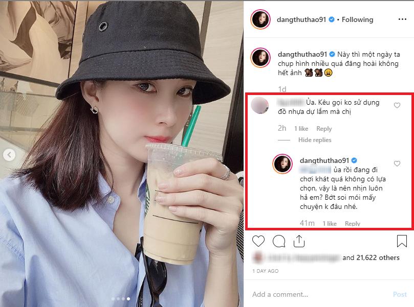 Cụ thể, khi người đẹp đăng tải hình ảnh thưởng thức ly trà sữa đựng trong hộp nhựa, một tài khoản mạng đã bình luận phía dưới bài viết: "Ủa, kêu gọi không sử dụng đồ nhựa dữ lắm mà chị?".