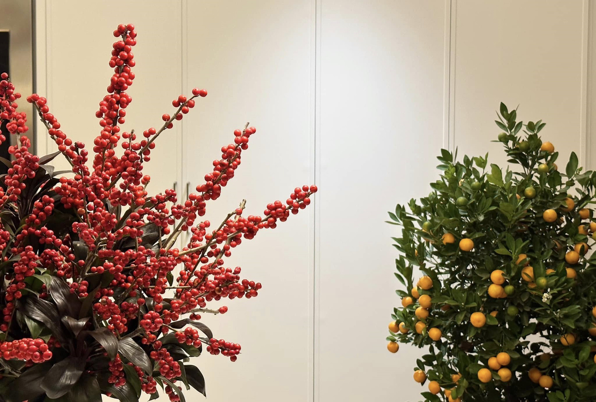 Trên nền màu trắng chủ đạo của căn nhà, các chậu quất, đào, đông đào giả, đèn lồng... đủ màu sắc thêm phần rực rỡ.