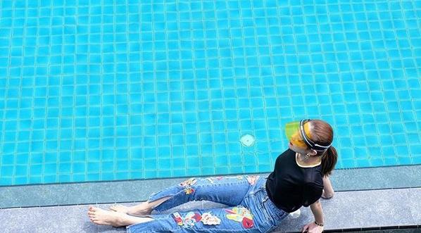 Thay vì mặc bikini phô diễn hình thể, Minh Hằng lại kín đáo dù tạo dáng bên bể bơi
