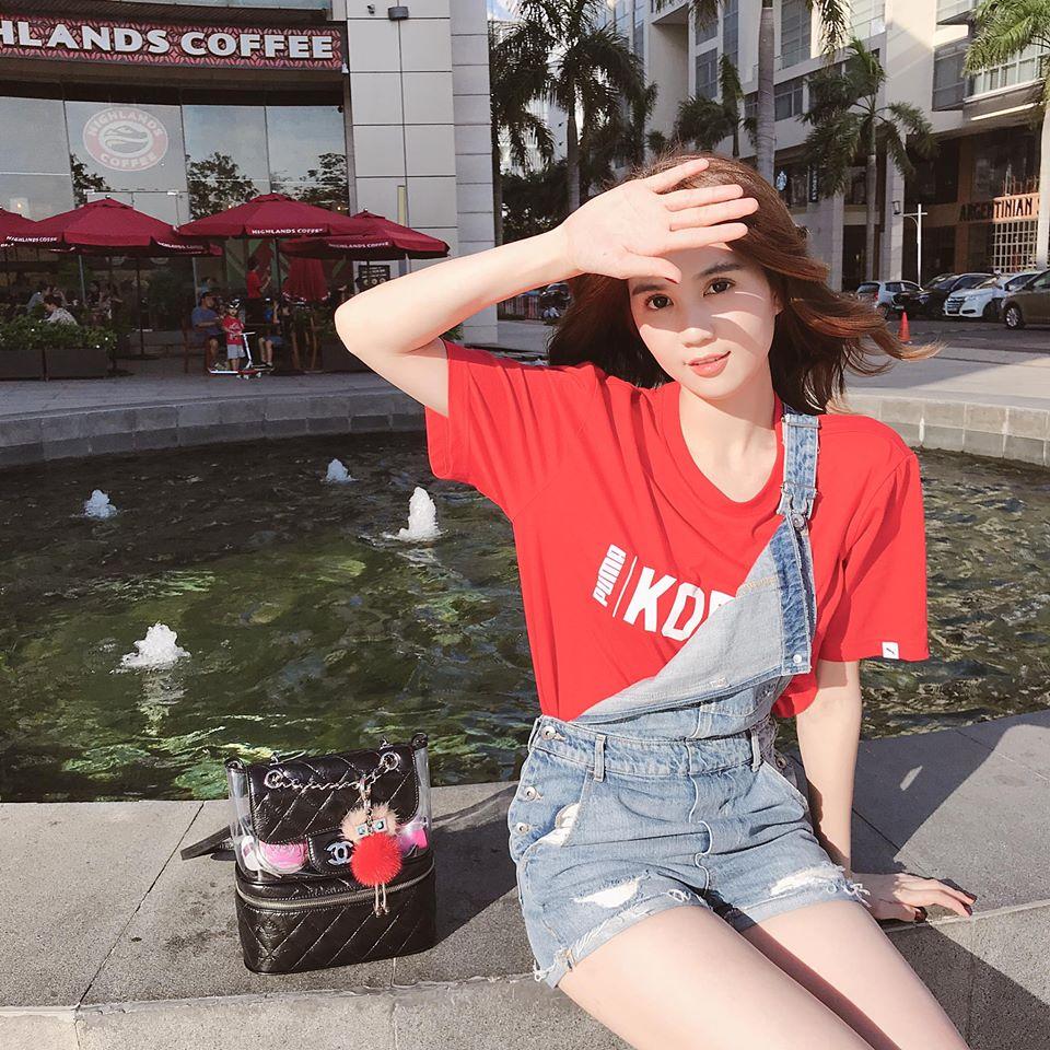 Ngọc Trinh cá tính với áo phông tông đỏ cũng quần jean xuống phố