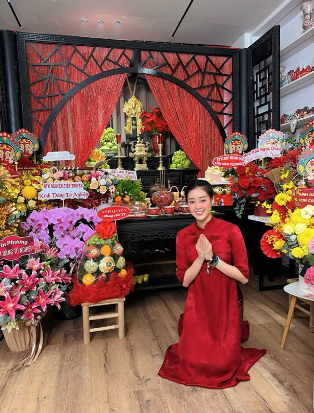 Mới đây, trên trang cá nhân, Khánh Vân cập nhật hình ảnh cúng lễ Tổ nghề gây chú ý. Trong hình, người đẹp diện áo dài dáng suông màu đỏ cùng ông xã bày tỏ lòng thành kính, tri ân đối với Tổ nghiệp.