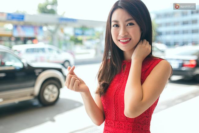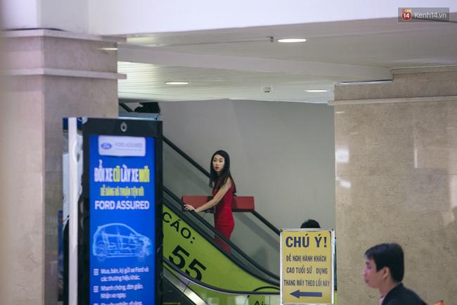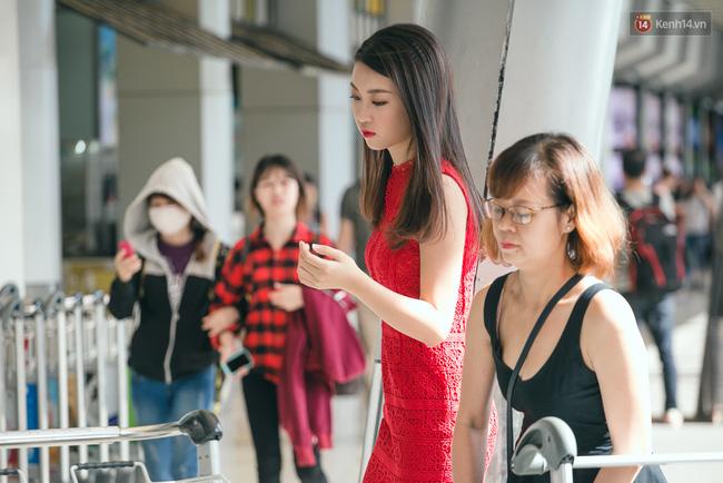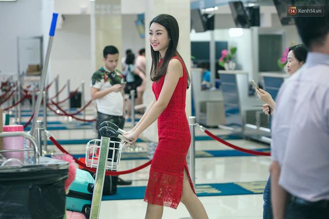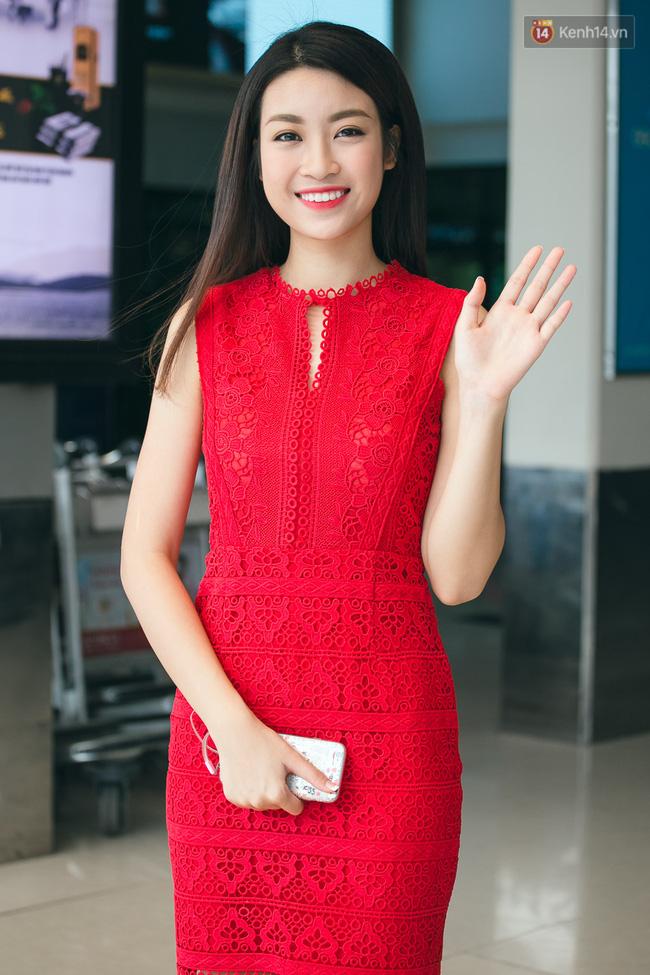 Xuất hiện tại sân bay với gương mặt tươi tắn cùng bộ váy đỏ rực rỡ, Đỗ Mỹ Linh thu hút mọi sự chú ý. Người đẹp nhanh chóng đẩy vali đồ vào khu vực thủ tục làm check-in.