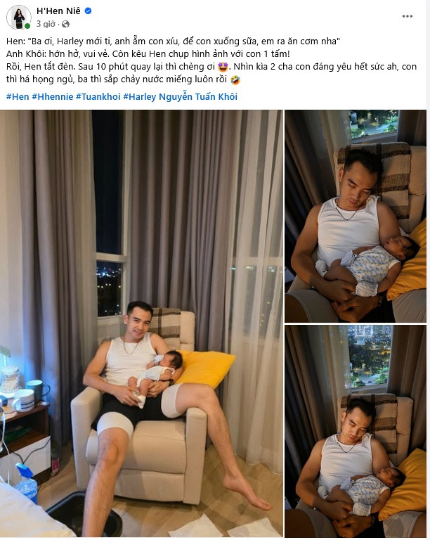"Hen: Ba ơi, Harley mới ti, anh ẵm con xíu, để con xuống sữa, em ra ăn cơm nha