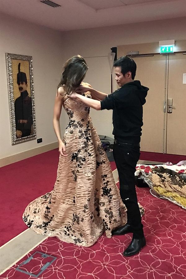Hình ảnh hoa hậu Iris Mittenaere thử đồ của Hoàng Hải từ trước đó.