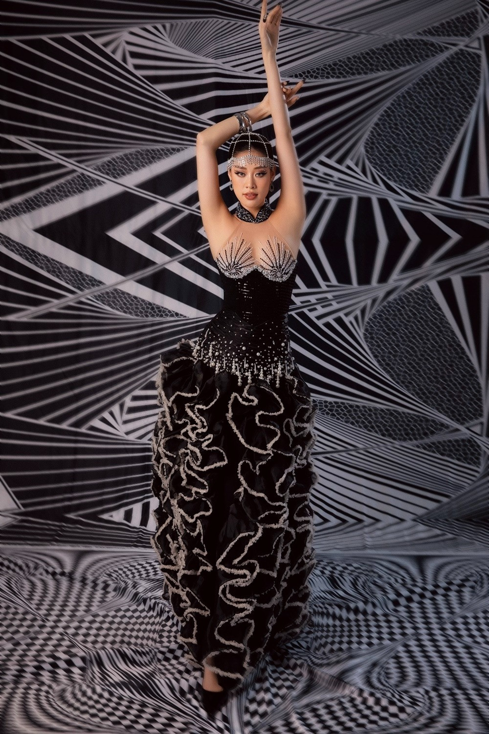 Hoa hậu diện chiếc đầm đen có viền trắng, phần ngực được đính kết tỉ mỉ tôn trọn vóc dáng nuột nà. Khánh Vân cũng có màn tạo dáng chuyên nghiệp khoe thần thái sắc lạnh trước ống kính.