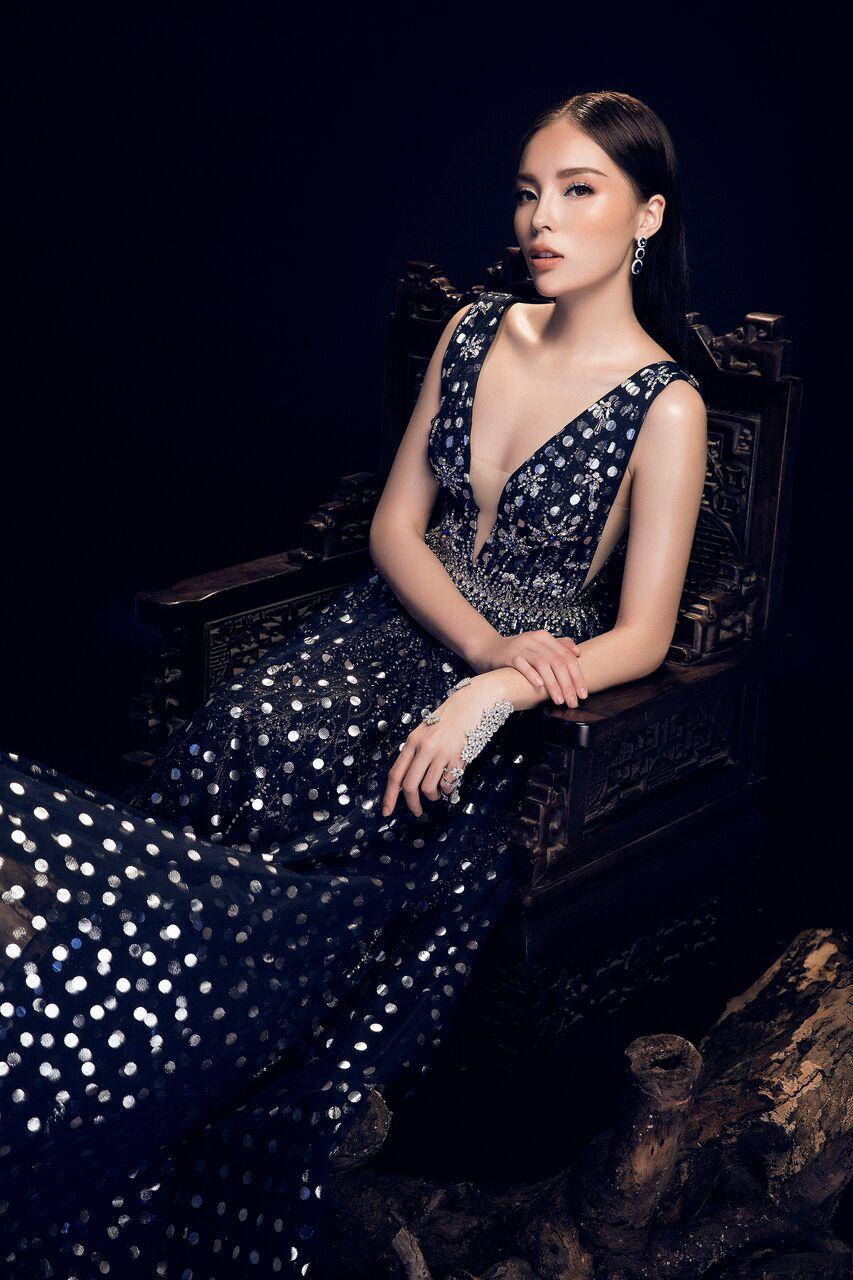 Thiết kế xẻ ngực táo bạo gam tối kết hợp cùng biểu cảm của Kỳ Duyên như đưa người xem vào một không gian huyền ảo. Bộ váy bó sát, tôn lên đường cong mê mặc.