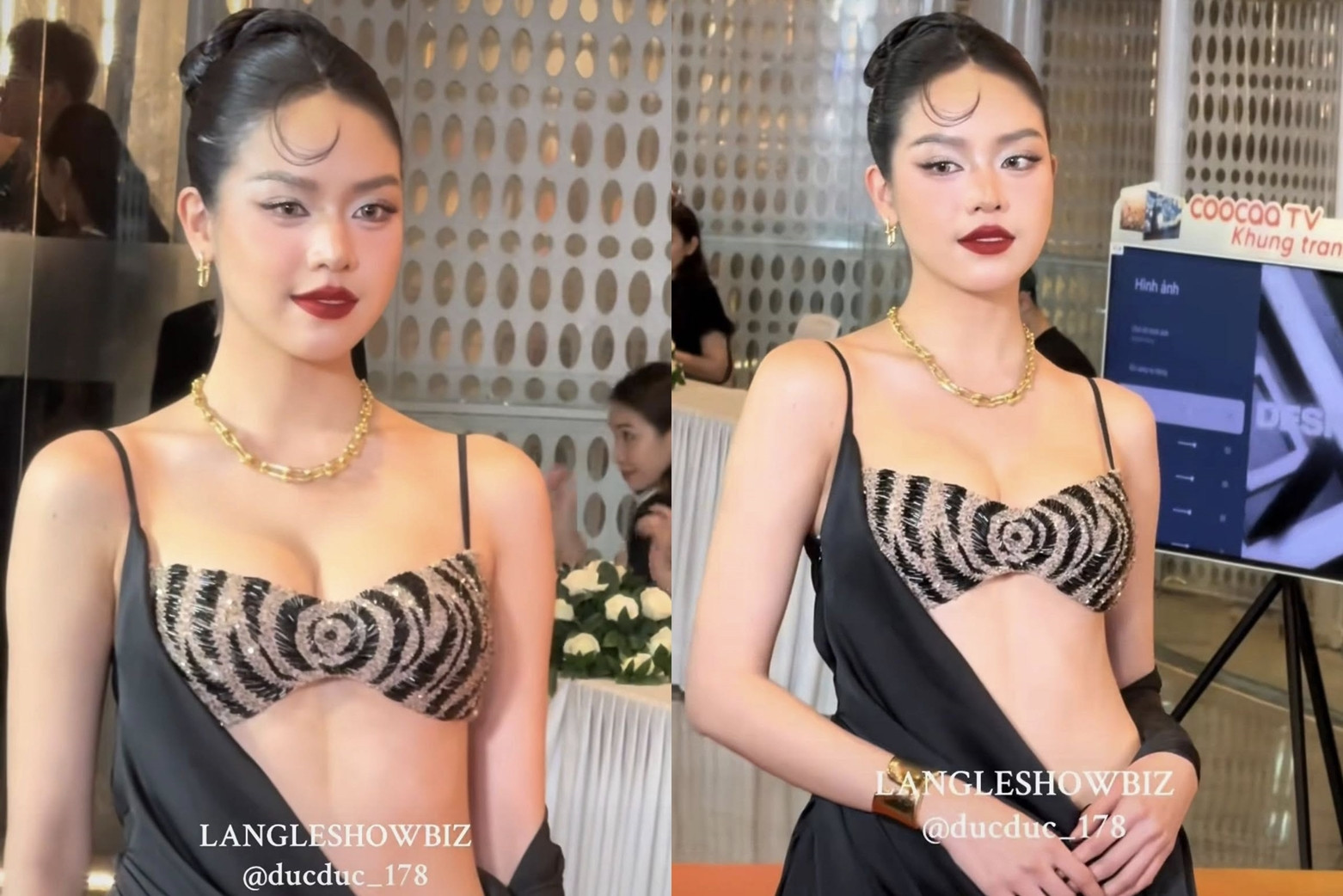Xuất hiện trên thảm đỏ, Miss International 2024 diện trang phục táo bạo với điểm nhấn chính là chiếc bra lấp lánh khoe trọn vòng một đầy gợi cảm. Đây có lẽ là lần hiếm hoi nàng Hậu "chơi lớn" như vậy.