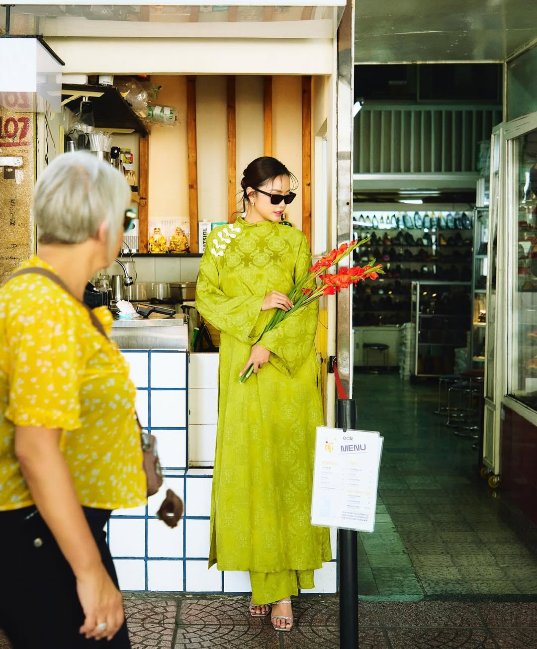 Hoa hậu Ngọc Châu chọn áo dài cách tân có màu sắc nổi bật, búi tóc cao với kẹp hoa để dạo phố.