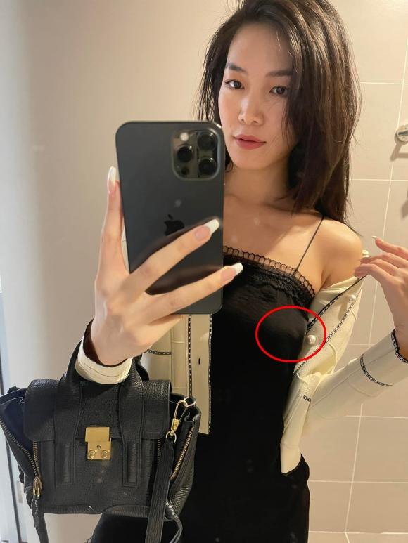 Tuy nhiên, khi lên đồ ra ngoài, Hoa hậu Việt Nam 2008 mặc nguyên bộ váy ngủ, chỉ khoác thêm một chiếc áo len mỏng mà bỏ quên nội y nên điểm nhạy cảm hằn rõ bên dưới.