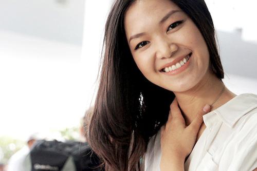 Hàm răng không đều lộ rõ khi Thùy Dung cười lớn