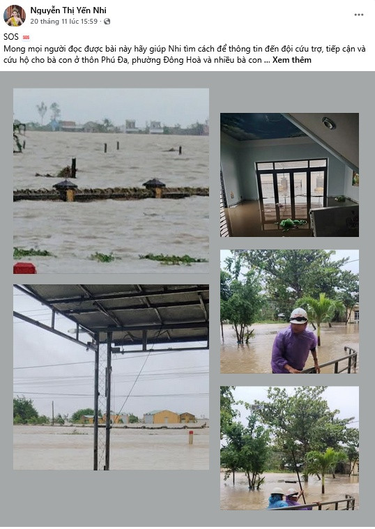Vào chiều 20/11, Hoa hậu Yến Nhi đăng tải bài viết cầu cứu trên trang mạng xã hội cá nhân. Cô cho biết gia đình ở Đắk Lắk bị ngập cao, phải di tản ra trường học gần đó. Trong lần liên lạc gần nhất, nàng Hậu chia sẻ bố đã đuối sức nhưng đã cố đưa bà và một số người ra điểm tập kết.