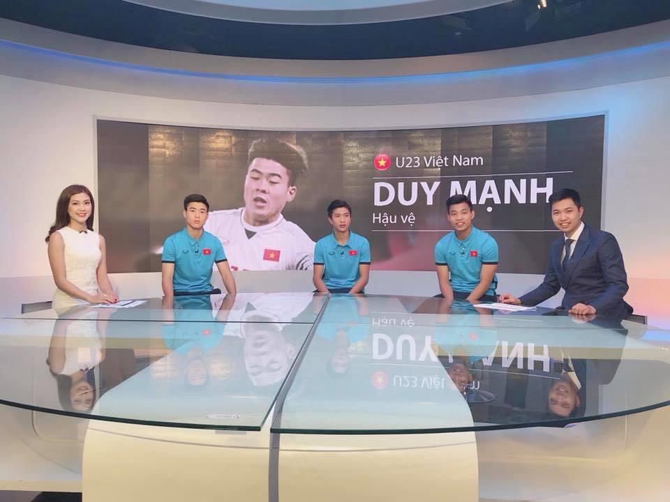Thu Hằng trong buổi giao lưu với các tuyển thủ U23 sau vòng chung kết U23 châu Á tổ chức tại Trung Quốc vừa qua.