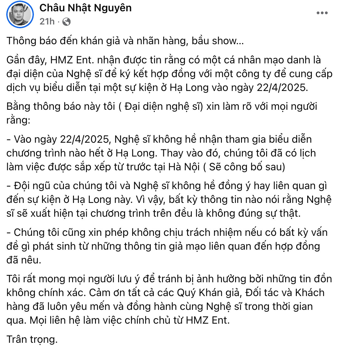 Người này khẳng định: “Đội ngũ của chúng tôi và nghệ sĩ không hề đồng ý hay liên quan gì đến sự kiện ở Hạ Long này. Vì vậy, bất kỳ thông tin nào nói rằng nghệ sĩ sẽ xuất hiện tại chương trình trên đều là không đúng sự thật”.