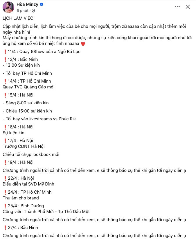 Ngay sau đó, nữ ca sĩ cũng cập nhật luôn lịch diễn công khai trên fanpage chính thức để khán giả dễ dàng theo dõi.