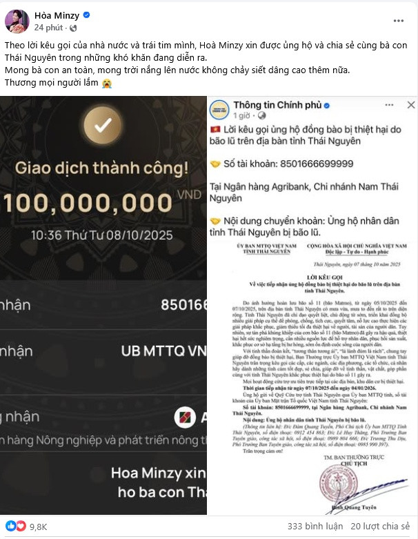 Nữ ca sĩ viết: "Theo lời kêu gọi của nhà nước và trái tim mình, Hoà Minzy xin được ủng hộ và chia sẻ cùng bà con Thái Nguyên trong những khó khăn đang diễn ra. Mong bà con an toàn, mong trời nắng lên nước không chảy siết dâng cao thêm nữa. Thương mọi người lắm."