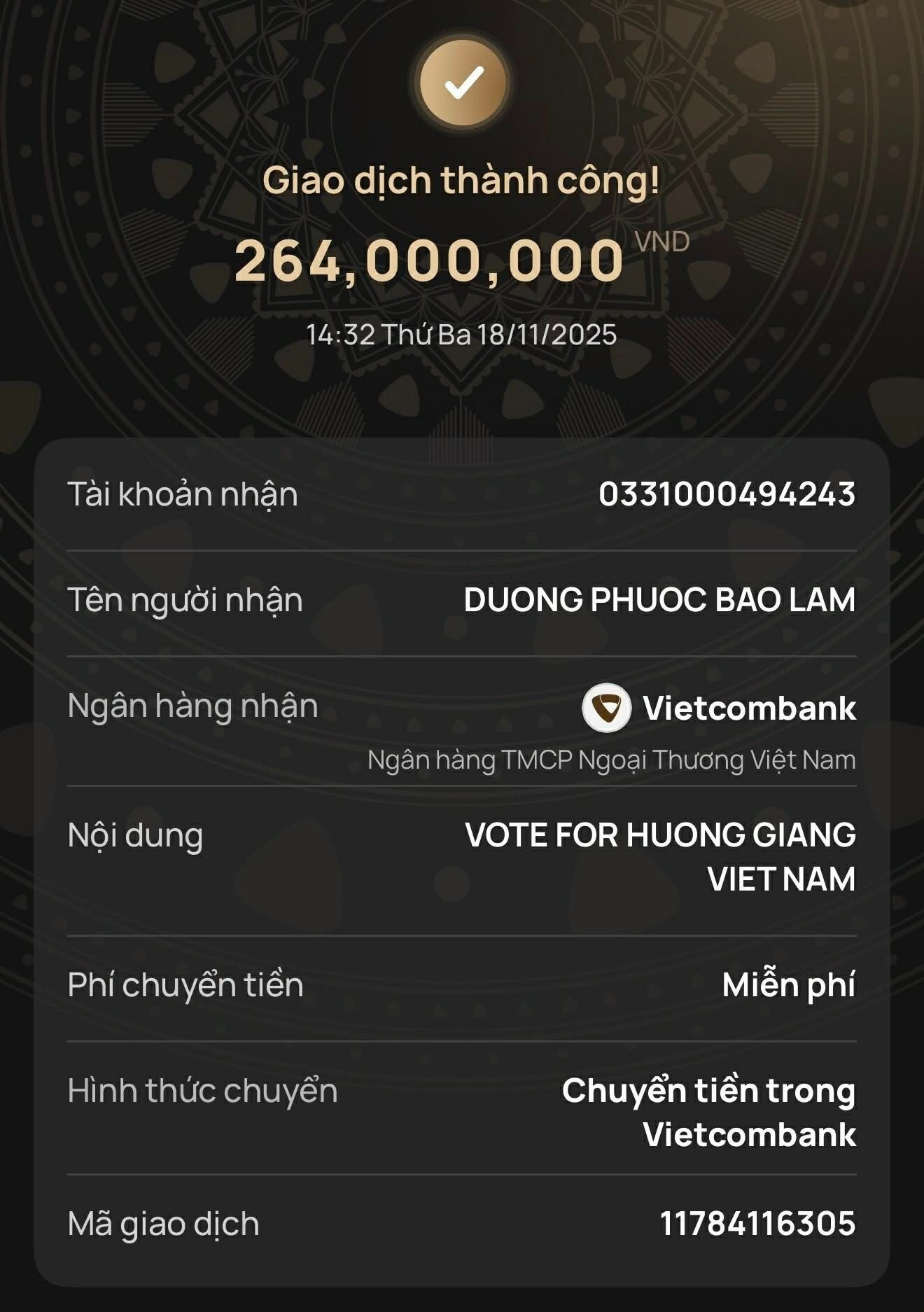 Trước đó, người đẹp còn chơi lớn khi chi tiền khủng để vote cho Hương Giang trước thềm chung kết Miss Universe. Cụ thể, giọng ca Bắc Bling đã ủng hộ 264 triệu đồng, tương đương với 50.000 vote để bình chọn cho Hương Giang tại hạng mục Beyond The Crown.