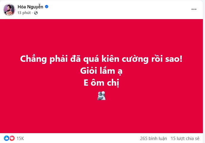 Sau khi Miss Universe kết thúc, Hòa Minzy liên tục có động thái gây chú ý. Nữ ca sĩ chia sẻ trên trang cá nhân: "Chẳng phải đã quá kiên cường rồi sao. Giỏi lắm ạ, em ôm chị".