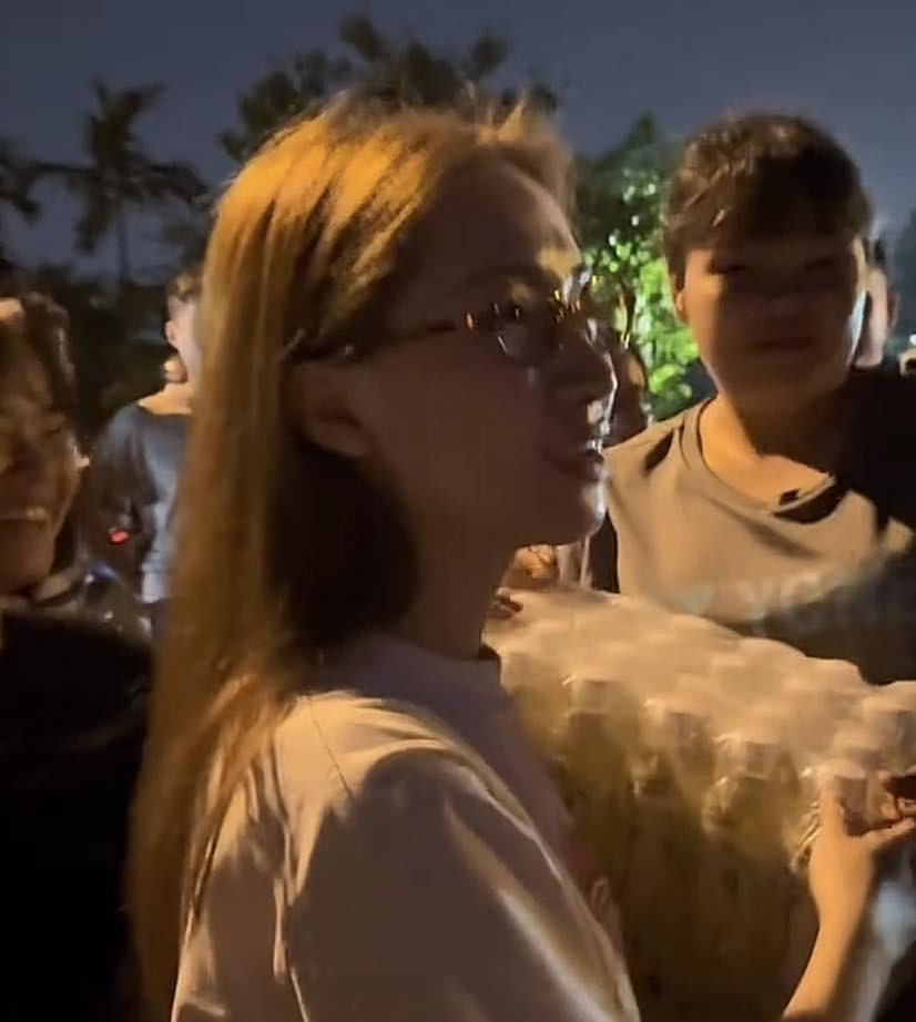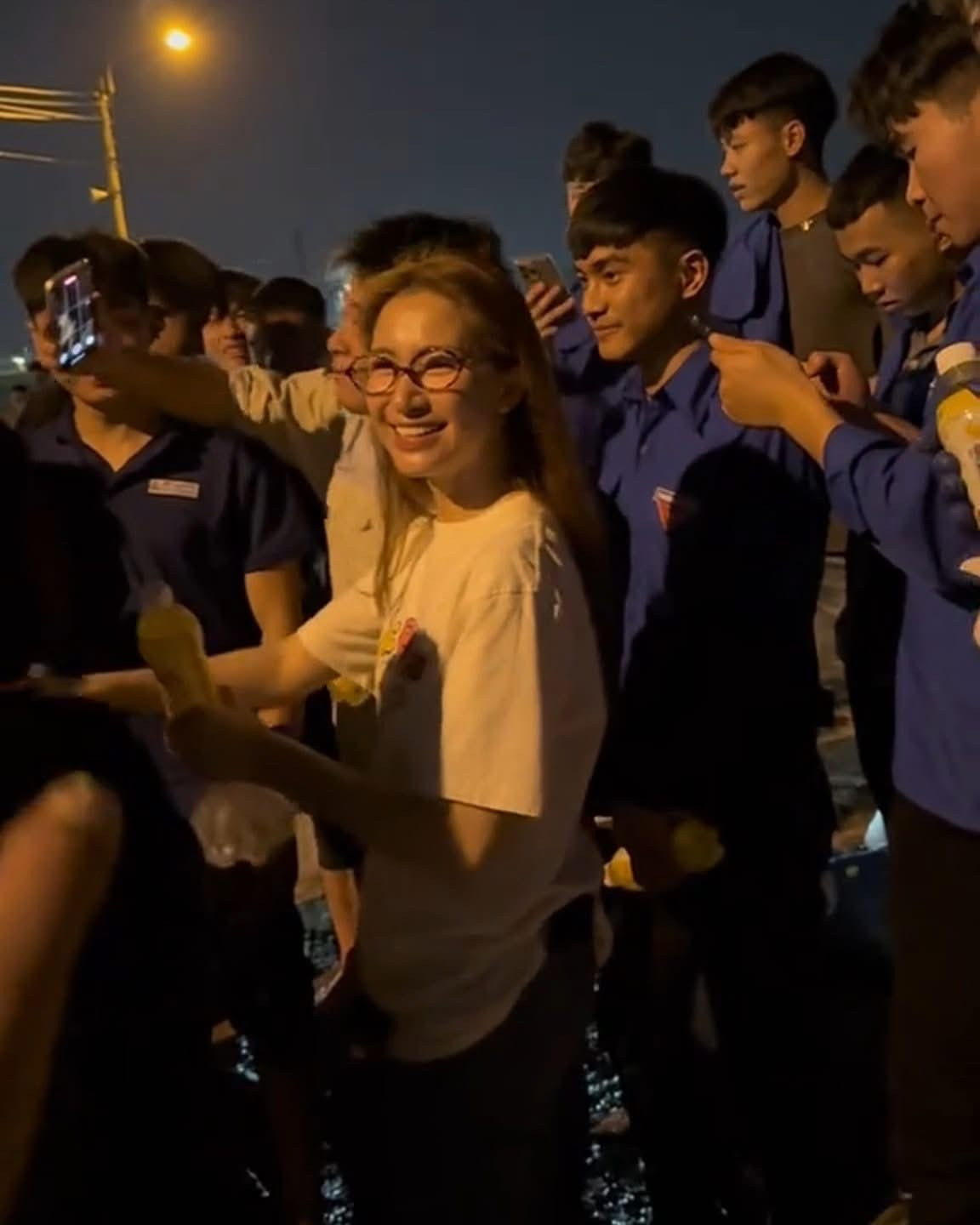 Trong video, người đẹp diện trang phục đơn giản gồm áo phông, quần jeans xắn gấu, thân thiện hỏi những người xung quanh đã được ăn gì chưa. Cô cũng chuẩn bị sẵn nước uống và đưa cho từng bạn trẻ để “uống cho có sức”.